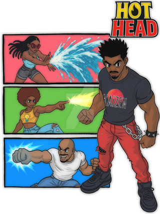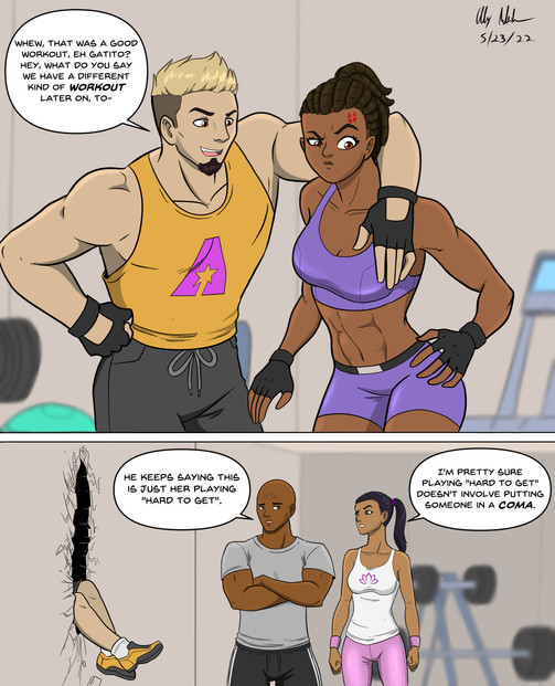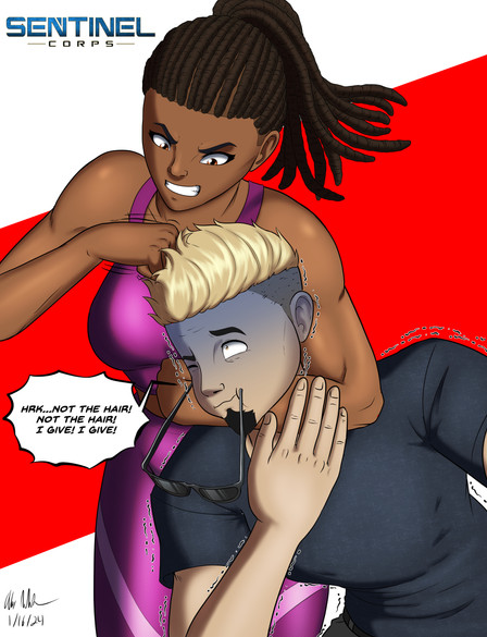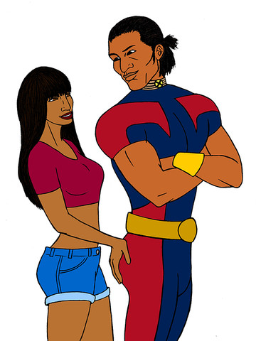 One of the more comical relationships within the team is between A-Game and Devil Cat. A-Game, as you all know, is the team's celebrity hero, who sees himself as a bit of playboy and a womanizer. After all, being a Hollywood movie star, and being on the cover of numerous magazines, it's no surprise that he can come off as a bit...cocky. A-Game's love life consisted mainly of one-night flings and there were few women who could resist his charm and status. However, that isn't the case when it comes to female members of the Sentinel Corps, who can see right through his act. Upon joining the Sentinels, it didn't take long for A-Game to try put the moves on the girls, but Crimson Glory and Aurora shot him down there and then. However Devil Cat, being who she is, decided to make a game out of it. While she won't falling for his sweet talking, she does tease him a bit, playing "hard to get" in a sense, giving him mixed messages to mess with him. Devil Cat, as you may have figured, isn't afraid to show off her looks, often wearing revealing outfits, being a sort of wild, party girl, always looking for a good time. As such, A-Game constantly hits on her, and Devil Cat always playfully shoots him down, always giving off those mixed messages just to tease him.The game however, went a little too far one day, when Devil Cat discovered a tiny little camera inside the women's shower room at Sentinel HQ, a camera that had A-Game's logo on it (probably a bad idea in hindsight). To say that Devil Cat was "pissed off" would be a colossal understatement. As a result, Devil Cat dislocated A-Game's arm, broke his jaw, and fractured three of his ribs in a merciless beatdown, which she referred to as "letting him off with a warning." After recovering A-Game and Devil still play their little flirty game on occasion, but A-Game knows better than to try a stunt like that again, at least for his sake.