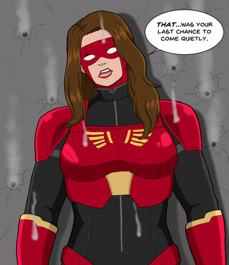Crimson Glory is the tank of the team. Not only is her skin, muscles and bones far more denser than a normal human, she is equipped with a suit of armor made of a titanium alloy that is strong enough to block a tank shell with ease, giving her even more protection. Combined with her immense strength, she is a force to be reckoned with as seen this image. Even a squad of highly trained mercenaries equipped with powerful assault rifles and pistols can't even make a dent in Crimson Glory as she rips open a metal gate like it was made of cardboard, bullets bouncing off of her armor.Related content