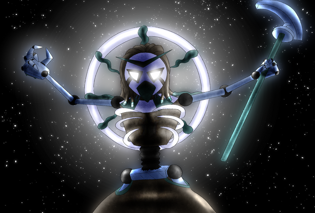 Profile: Discordia came to be a little after Harmonia (the being created when Zenyatta and Genji fuse together), but the circumstances are not yet known (ie I haven't come up with the backstory yet). They are an odd contrast to both Harmonia and the Omnics that they are made from. Discordia is...strange, to say the least. He does not speak, and when prompted to talk, he will simply put a finger up to his jaw in a shushing gesture. When questioned after splitting, Mondatta and Max simply said that if their fusion spoke above the tiniest, faintest whisper, chaos and discord would befall all in the vicinity, so they simply agreed not to talk as Discordia. Others are not entirely certain if this is true or not.