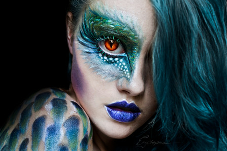 i love the make-up, it looks incredible. and the colours in it really bring out the colours in her eye too. the pale skin && black background work as a nice contrast, and make her eye stand out even more. it really caught my attention, great work!