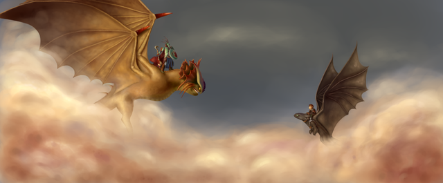 This piece is very atmospheric in the sense that you get a wonderful conceptual view of space- a rarely used attribute in some art these days- and the warmth of the painting by the colors of the clouds and sky together. You did a lovely job, and this is quite a unique view; I haven't seen a picture with Toothless/Hiccup from this view yet! Lovely job dear.