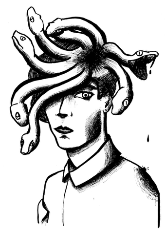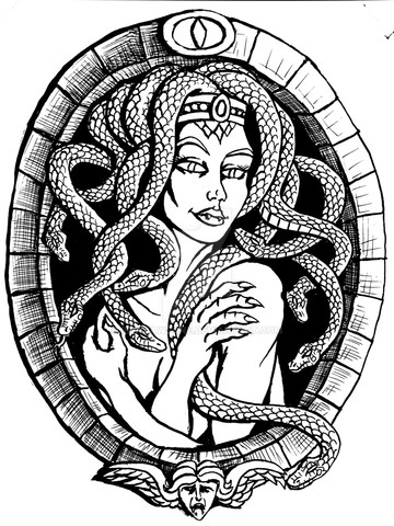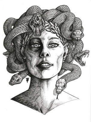 I think that Medusa may not be as ugly as the myths say - perhaps she is so beautiful that she stuns those who look at her. Â But, every time she gets close enough to someone to experience love, the snakes in her hair strike before they, or she, can stop it.Ink, 11 x 14 inches