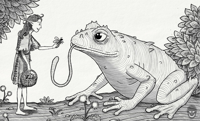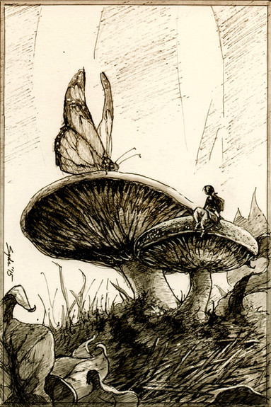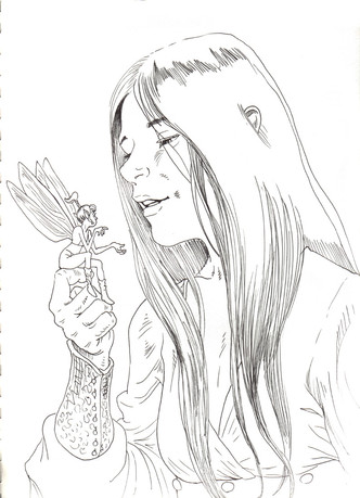 I like the mischievous look on the fairy's face; along with the knife, it takes a moment before you notice it and wonder, with pleasant tension, who is going to be the prey here. There is a nice contrast between the bulky cat and the diminutive fairy. Tiny details (the somewhat misshapen feet, the dark shading) suggest that she is more of a brute than you'd expect.