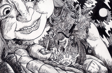 The light levels of the background adhere to a simple balance, with dark grey at the top, light grey at the bottom, and a sort of yin-yang white-and-black in the middle. It's also interesting how the perfectly horizontal and vertical lines can be found at the top of the drawing, in the Firm Reality of everyday suburbs, while the rest--the world of the animal and its magical adversary--is more carefree and curved. The first curves on the grass appear very close to the final straight lines, giving you the feel that, at times, the Strange is just inches away from the Normal.