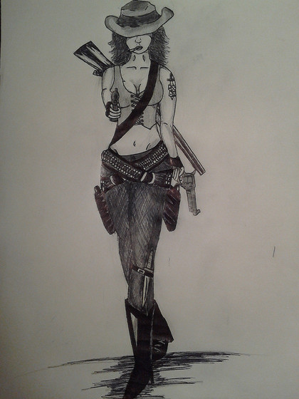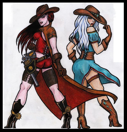 I finally managed to get some color work in. It's been a long and arduous process but I finally managed for something different and worth trying out to pop into my head. I've been under a mound of things to do as of late, what with the whole wedding and moving and all so I really haven't had any creative sparks flying lately.But this one actually came to me in a dream. I don't remember much of it but I was apparently the sheriff of some old west town and these three different women took me out (what a way to go though).