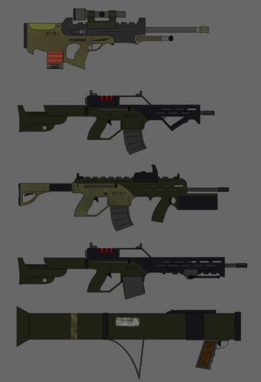 The latest assault rifle in my collection. It was inspired by the Beretta Cx4 Storm. There are five versions. The standart rifle, LMG version, sniper rilfe, commando carbine and grenadier. The weaponsystem is designed to be interchangeable.Related content