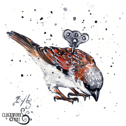 Love love love this one, so much that it was necessary to say "love" three times. The clock is so wonderful and as usual the bird is as well. In a way it almost contradicts itself, birds have come to stereotypically represent freedom, and clocks to represent a time trap, or the opposite of freedom. the two together whip up a philosophical roller coaster. Nicely done!