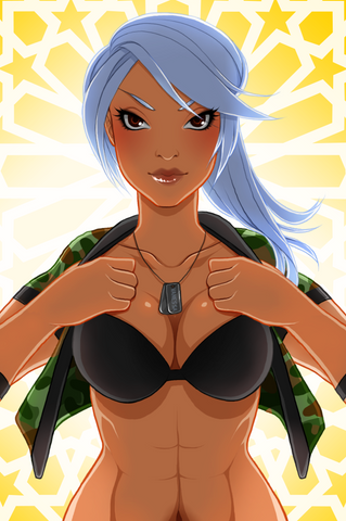 Oh my goodness I love her! She's so fit and her pose is so "in your face." I imagine her being this really out there California girl. She exercises at the gym everyday when she's not living it up at a party somewhere. Such a wonderful character!