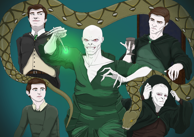 I like your version of Tom Riddle. AIt's interesting that you think he doesn't look Voldemort like at 51. Are the 2th and 3rd from the right Riddle as teenager and when he visited Dumbledore for the DADA job?