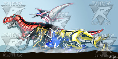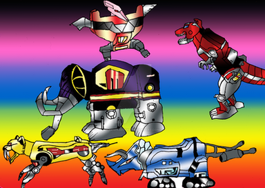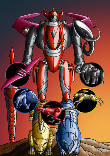 According to science on the tyrannosaurus, triceratops, pterodactyl & other prehistoric animals, their skin color is unknown. But in the PRU, the color of all the prehistoric animals the MM/Zyuranger zords are based on can be those colors in the prehistoric times which should explain how the MMPR suits are in those colors... yeaaah. I know the all Ranger's color are due to their main zords's color. But that simply causes the question; why are many zords colored anyway? And with that, cause most Black Rangers emitting dark purple energy, are the "Black" Rangers really awesomely dark Purple Rangers?... Oh by the way awesome art.