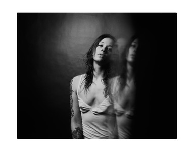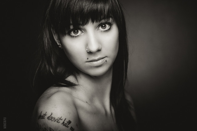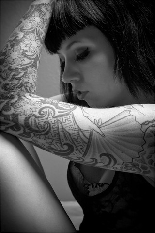 I like how this looks kind of like a classic, old-fashioned shot, but the tattoos give it a modern twist. I only wish she'd been wearing something strapless, so you didn't have that line going down the middle of her tatt.