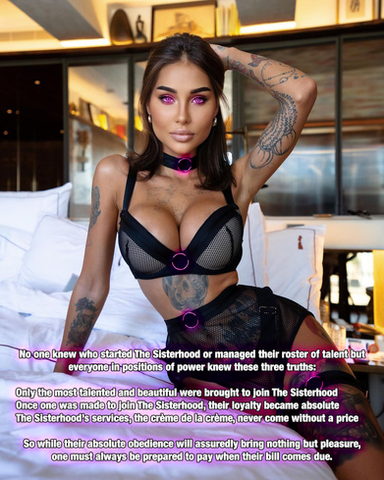But she knew this moment of pleasure was entirely in service of her primary objective. She would, in his moment of pleasure and vulnerability, coerce him into divulging the key secrets The Sisterhood sought. His business empire, his government contacts, all would willing spill forth from his mouth as pillow talk. She would ensure enough pleasure that he would, innocently seeking her approval, betray all those around him without even realizing there was anything wrong.