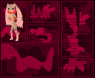 Well, well, look who's back and has gotten a slight update again because I once again had an issue with how child me created my OC. She still retains the whole Team Rocket experiment lore, in the most basic sense, so it is mostly a slight change in colour and some basic summary sheet changes. Now with stats and a proper moveset. She grows up so fast.