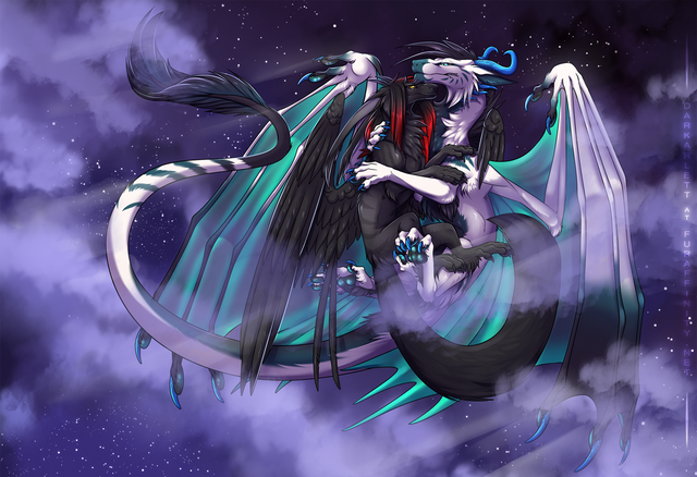 #artwork #black #clouds #dragon #frills #fur #gift #glow #horns #karis #moon #night #paws #plating #purple #scales #shadow #shadowcloud #shine #sky #stars #violet #wings #wolf #red_eye #yellow_eye #size_difference #art #karisthewolf #varness_crowe