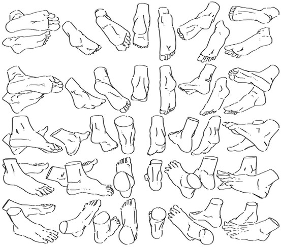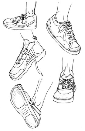 Although it is possible to animate a walk-cycle with a minimal number of drawings, I consider it to be better to have around six per angle (with an exception to the profile angles). This chart provides all the basic shapes needed to draw a walk-cycle for a character wearing sneakers/trainers at eight angles. Flip the image if you need the left shoe. Since I remember having a LOT of trouble drawing feet, I highly encourage beginners to trace these drawings (experienced artists should just use it as a reference). Please link back to me if you use it.