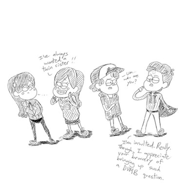 Oh my gosh I am soo sorry this was much longer than I meant to. I got carried away. Tho I actually love Bill Jr Billy and Valkari and I wish they were actually in the show cause their cute. Bill Jr takes after Dipper some after a while and Billy loves getting made sweaters from Mabel with stitched on ties. And Valkari normally matches her lips and bow to the colors Pacifica wears. Ok I'm done now. sorry. xD