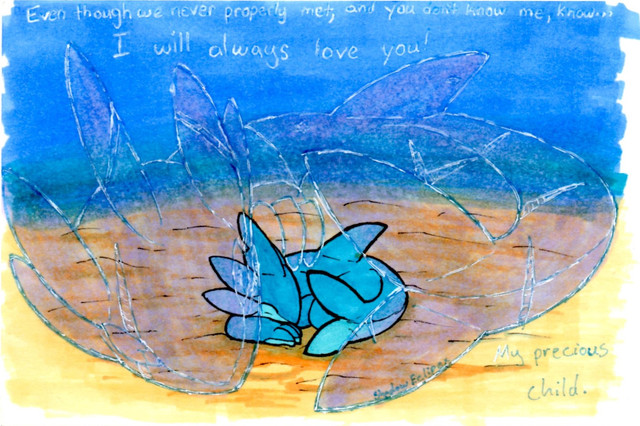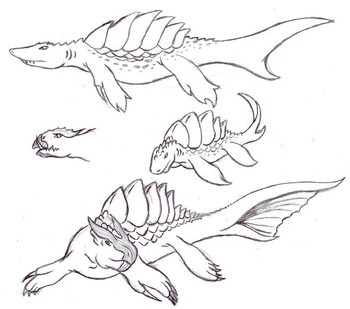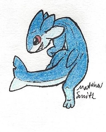 Here is a new character that I have plans to add to my RPG idea. Some short of Amphious Shark that I have dubbed Sharkelottel, because the fins on the side of it's head remind me of an axolotl.He is a young Member of his species not even a full year at the time of his appearance. After the cast meets him and share some food with him, he starts fallowing them, and later starts fallowing Midori around.