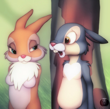 (These characters are portrayed to be of age.)The characters are Miss Bunny from “Bambi” and Hazel (fan name) from “Sword in the Stone”.