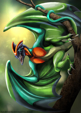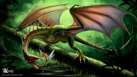 Everything about it seems threatening. The scales, the wings, the fangs, the tongue yet at the same time its throat appears to bare that of a roosters'. Still, it's a nice deviation.