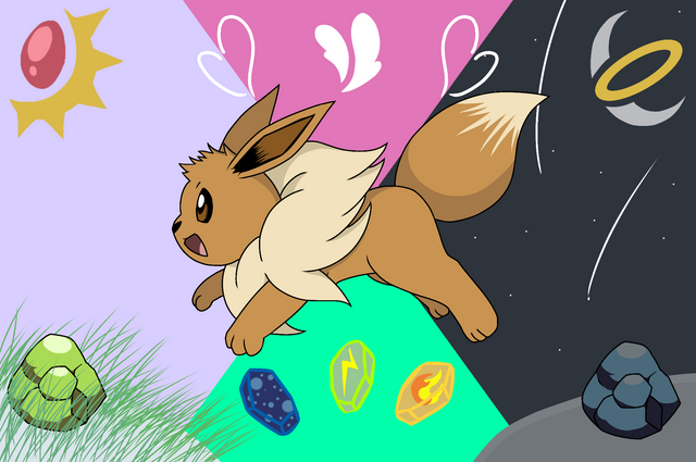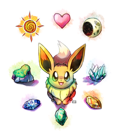 I know Eevee doesn’t evolve using the Sunstone, and/or moon/dusk stone. I was actually in the middle of drawing this when I decided that instead of a regular sun and moon, to represent night and day in the background, I was going to make them crystal as well, then I thought it would be even cooler to have the sun be the actual sun stone, and the moon to be crystal in the same colors as the duskstone. (With the galaxy inside of it)