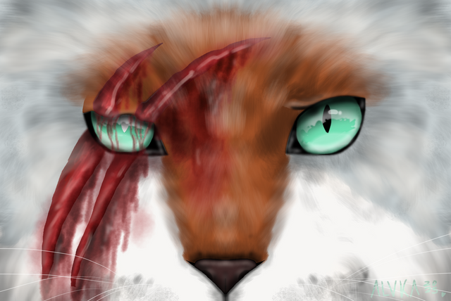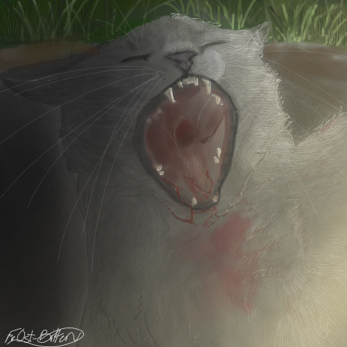 Well this is Brightpaw one of my favorite characters and in the book A Dangerous Path, she goes to prove her loyalty to Bluestar by going to chase off the dog pack with Swiftpaw. In my picture I drew Brightpaw seeing the dog about to attack her, which in the book she gets half her face torn off.