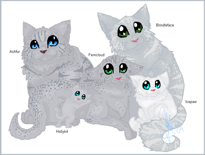 I know, his daughter could be blue-gray or blue-silver and maybe have white-tipped fur. Like how Echomist in Crookedstar's Promise is gray with white-tipped fur that makes her look 'cloudy'...Sugarkit wouldn't be bad, neither would Twilightkit or Cloudykit? She sounds beautiful and so tragic.