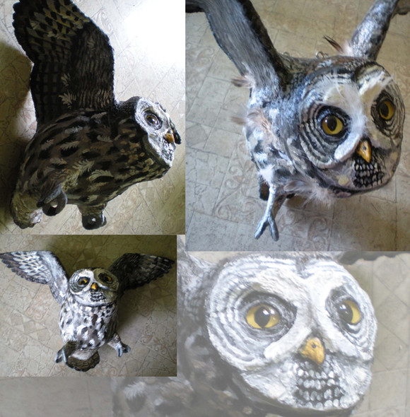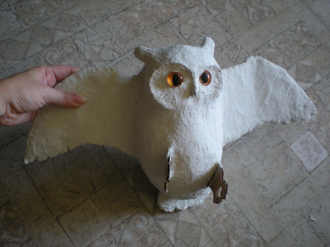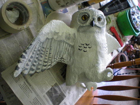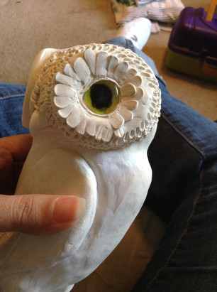 very much still a WIP, not quite happy with his facial feather markings yet but then I just started painting last night so still pretty rough. I realised when I started painting his face I didn't get his facial features quite as symetrical as I thought I had, but I'm gonna chalk that up to the unique character of the bird esspecially since he is suppose to be really old and rather quirky. I figure it will all come together as I get the painting right.Errol is going to be a great grey owl, I hope to paint in feathers in a way to make him look scruffy and older as I continue to paint him so he matches with the description of Errol in the HP books wich I believe describe him at one point as "a mop of feathers"