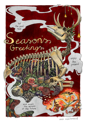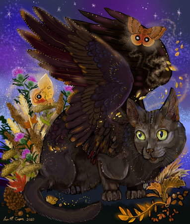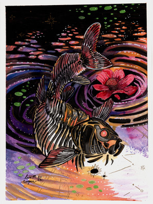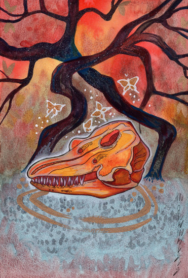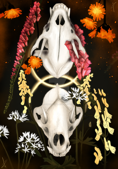 I decided to make a series of paintings to go with the first one of the kitty skull as I am enjoying the color scheme and theme, and I had also been wanting to paint the nasturtium I grew this year as they also have some. I'm calling this one 'Resonate'