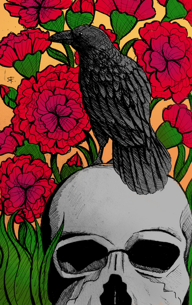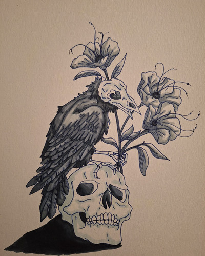 #autumn #bird #fall #flower #flowers #halloween #memories #nasturtium #oarnge #raven #remeberance #samhain #skeleton #octoberart #ravenskeleton #allhallowseve