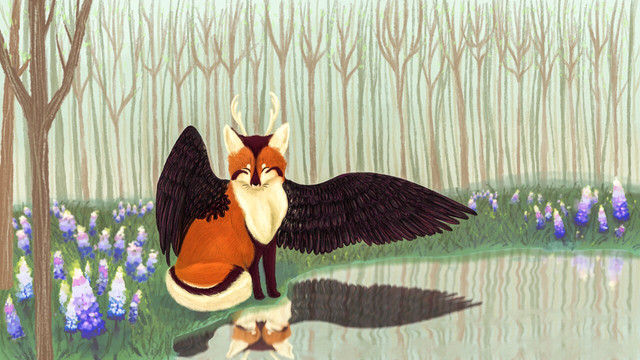 The Kitsune or nine tailed fox a shapeshifting magical creature from legends dances amongst columbine flowers in this digital painting.