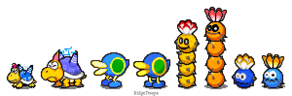 From left to right:Jelectro (SMB3), Bristle (Paper Mario: TTYD), Strollin' Stu (Super Mario Sunshine),