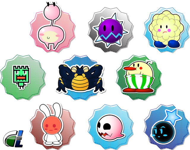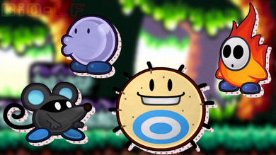 Dune Bud + SMW Fire Flower (Super Mario Sunshine), Glitz Pit Security Guard species (Paper Mario: TTYD), Little Mouser + Double Cherry (SM2/USA, SM3DW).