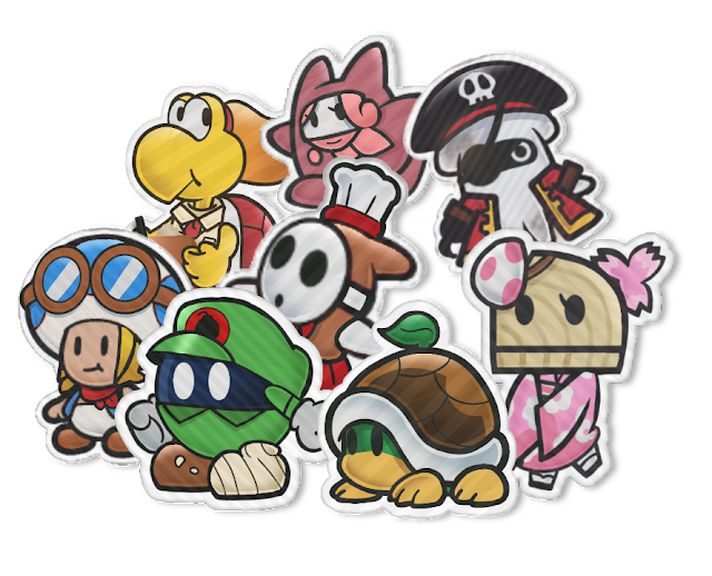 From left to right:Mole + Clown Car (Captain Toad: TT + SMW), Ice Snifit + Snufit (M&L: SS + SM64),