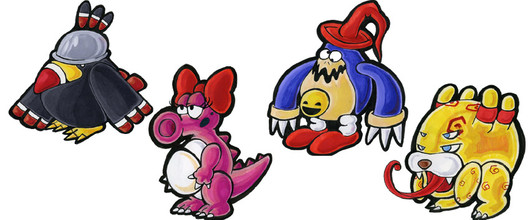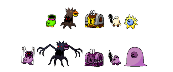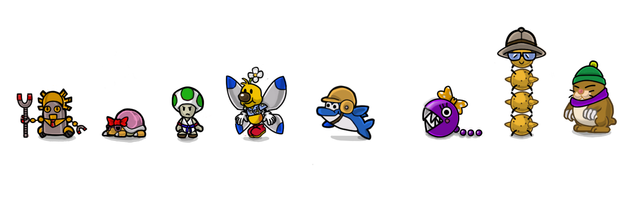 From left to right:Mini Urchin (NSMB2), Beta Bat Twirler (Luigi's Mansion), Muth (SPM),