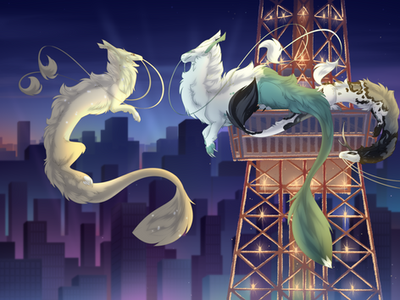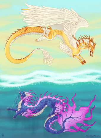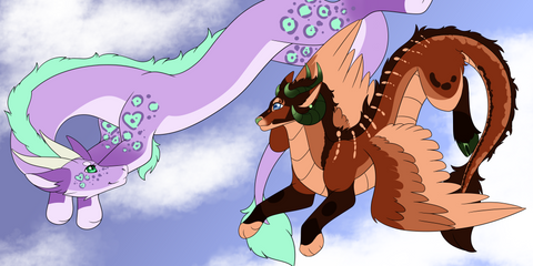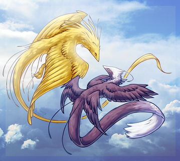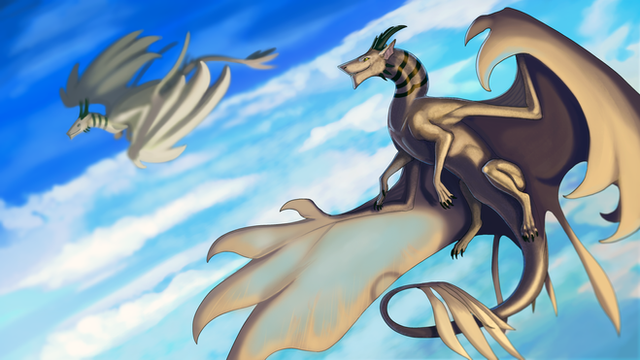 Something I started yesterday at 4am but didn't get round til until a few hours ago XD The ever famous Teegan and her half brother Donnager, enjoying an pre morning flight. I was meant to put the subtle differences in this one but ugh, fail. Donnager is bigger than Tee, and is perhaps a little more heavily built, having been trained for battle. Donnie's rider is a Tayra called Viper (whom has still to be uploaded by DustyCrophopper86 ), and he comes from a family of Thil breeders. Viper and Falidae meet after their Thils literally collide mid flight and Falidae falls to near enough her death, before Viper saves her XD Donnie and Tee realize they are in fact half siblings and play... a lot XD Mostly by command of Teegan.Ā