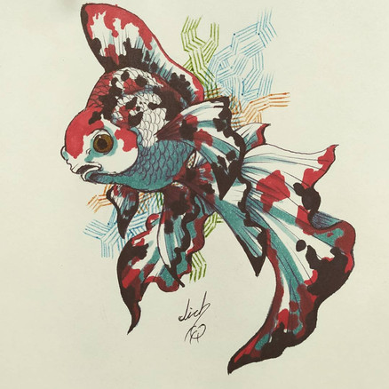 I completed this piece a couple weeks ago. It helped take my mind off of tragic events around the same time. I loosely based the design off of Seaking from poke'mon. He's accompanied by a pair of goldeen. Their body shapes are similar to ryukin goldfish.