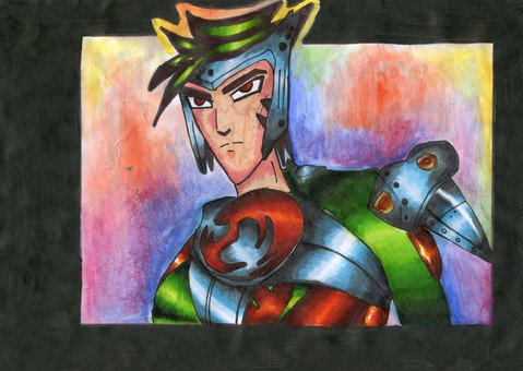 I like his armor, and the tubing very much. His hair is wild and I like how you managed to get all three colors in there and still make it look good. And I REALLY like the red lines down his face. Makes him look more.. dangerous!