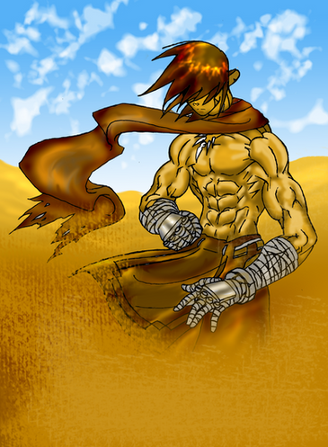 I really like the foot, the forearm and hand, the face, the cloth, the pose, the billowing sand and the way you handled the lineart/shading. There's a strong sense of movement, in the character and the storm.