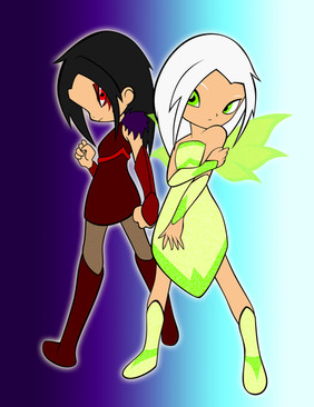 The girl on the left is from the "Shattered Glass" (SG) dimension that never aired but was teased by the shows' artist, Derrick J Wyatt. What that is is basically the Anti-Verse where the good guys are bad and the Heroes are villains. In the teaser, where Sari is clad in yellow with red hair, SG Sari is clad in purple and green with purple hair.
