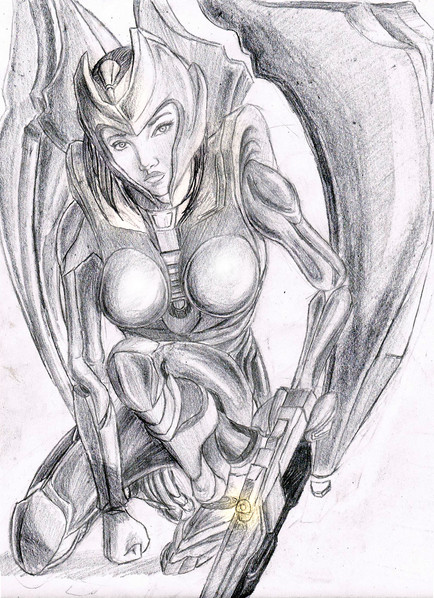 New armor design for our favorite Techno-Organic! Yeah... couldn't resist.Anywho, for some reason, her hair is faded out, but you can still -sorta- see it. I cant draw hands worth anything these days so I stopped her arm below her shoulder.
