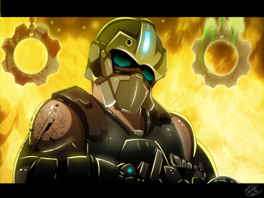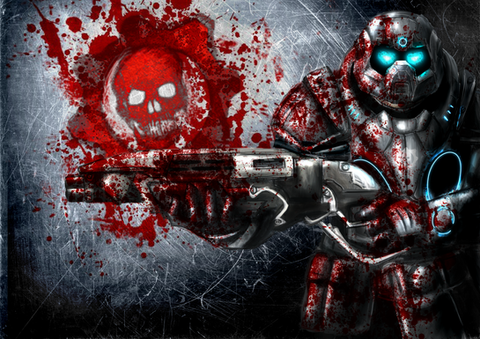 I was thinking of making a detailed Cog Soldier but after tinkering on him for a while, decided to do a shilouette of Carmine [I love the helmet he wears *3*] behind the splattered Cog.