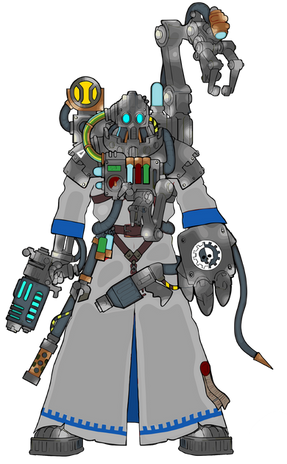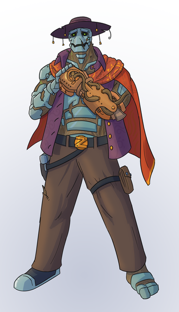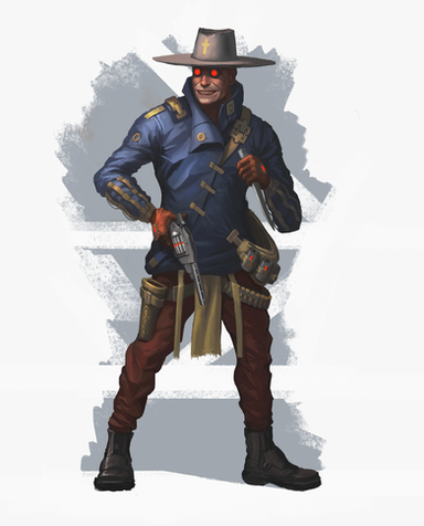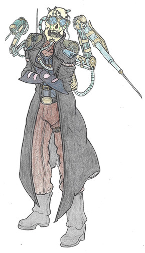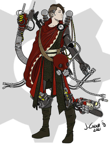 Art by Loggy (Loggybearart@gmail.com)This is a redesign of Preston Garvey from Fallout 4 as a cyborg using parts from Fallout robots: An Assaultron Arm, a Mr Gutsy Eyepiece on his face and a Protectron Leg. Idea is to emphasize that the Commonwealth is more technologically advanced than the Capital Wasteland.