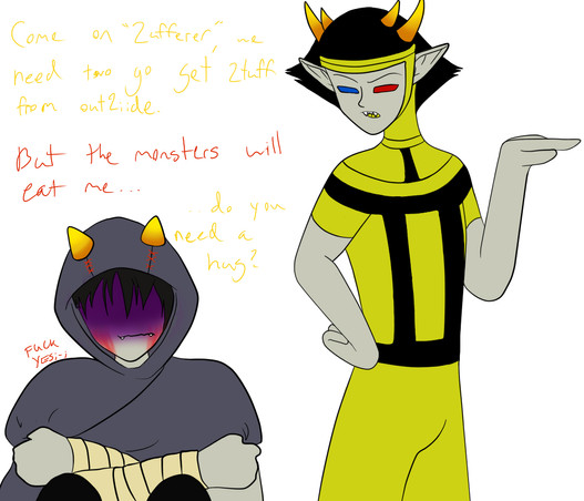 When she was born, her brain lacked a certain chemical that controls body temperature and is necessary for trolls to survive. Within minutes of hatching, she fell very ill and had an enormous fever. With no way to help and nothing left to do, the attending trolls cast her out into the caverns to die. However, a miraculous event took place. A Tiger-like lusus, who had been wandering the caves in search of a child fresh out of their trials to parent, happened upon little Perlan. It's particular species is known to be very vicious and wary, but also contain a fluid in their horns that has traces of the chemical Perlan lacked inside of it. For reasons still unknown to everyone, the animal broke off its horn and stabbed it through the young wiggler's skull (hence the scar). This supplied her with enough of the chemical to survive while triggering the glands in her body that are supposed to produce it naturally. The downside, though, is that the other chemicals in the fluid addled her brain a little, and screwed up her vision. Now one eye sees normally, but the other sees hallucinations.,The lusus took the wiggler in and raised it as it normally would have. Perlan's metamorphosis period was thus delayed for quite some time, and she never went through her trials. Because of this, many doubt whether or not she should even be alive and among their ranks.
