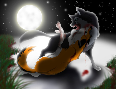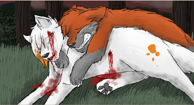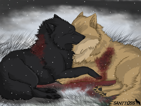 Kapiemete, the reddish wolf, was attacked by a cougar, so that explains all her boo-boos, but Peclef had to drive the cougar away, so he's a tad bloody as well.