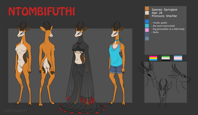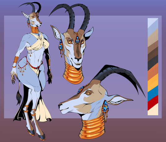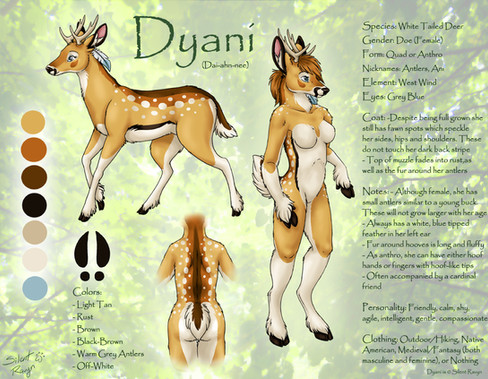 A fun reference sheet commissioned by Prongy of her springbok/Philippine spotted deer character. She let me design the majority of this fun hybrid doe, which was terrible fun