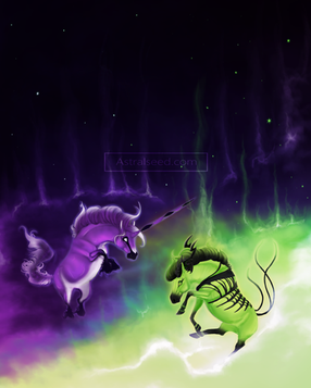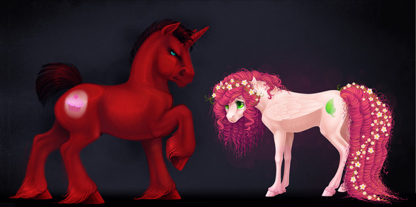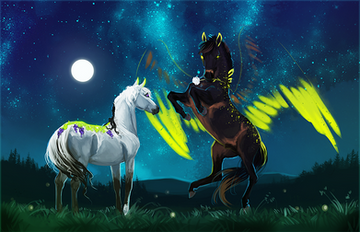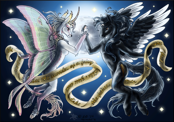 THe coloration choices are superb!!! THe way you used a gradient on he body as well as in the sky makes the pinks and purples really pop. Your detial of the hair and mane is also fantastic, with the shading and highlighting making each strand visible and the direction of the hair is quite visible as well, bringing movement to your drawing. THe glitter on their faces is also brought out by the stars, and there isnt too little or too much. It also enhances their eyes which are realistically detailed as well. The orns looks like crystal, you catpured the light and facets really well, and I see no faults. The only thing that might be a little off- I'm not 100% sure it should be- is that the body of the pink horned one looks a tad too small compared to the blue one, not just in perspectie, about how it is farther away, but it looks a bit too small for the anatom to hold up the pink one's head. perhaps it is that the head is very furry, or this is the way the glitter creatues look, idk. There also could have been a little more shading, depending on the sky, especially since there is no moon and the sun is just coming up(or down?) the side closest to us would be darker, less the glitter creatures have luminescence, and the fact you wanted to show how toned they were.