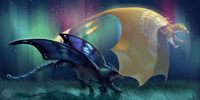 This was a commission for edelilah of her and her friend SA1B0T 's beautiful Minkin characters named Evening and Umbra. Evening is the sickle-horn and Umbra is the crystal-horn. Evening has the rare ability to control a starry mist, and so she is showing it to Umbra (much to her apparent delight).