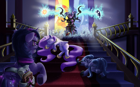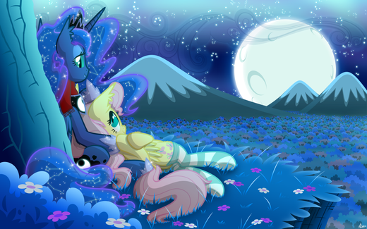 I really do miss him. He is the only friend I've ever had that I've lost, and he was a really good friend. So this is his OC (Mossy Hooves) cuddled up to Princess Luna, who was his favorite pony. I placed them in the Canterlot Gardens surrounded by a bunch of critters. I hope that wherever he is, it looks very similar to this