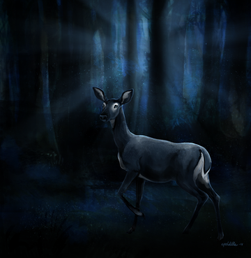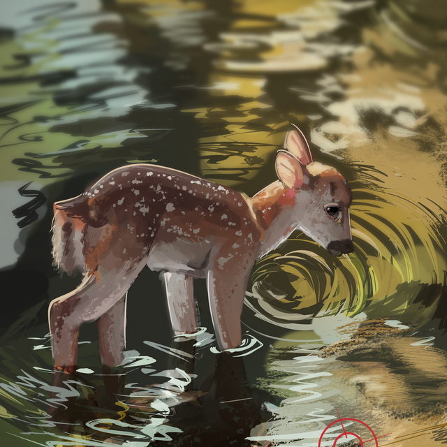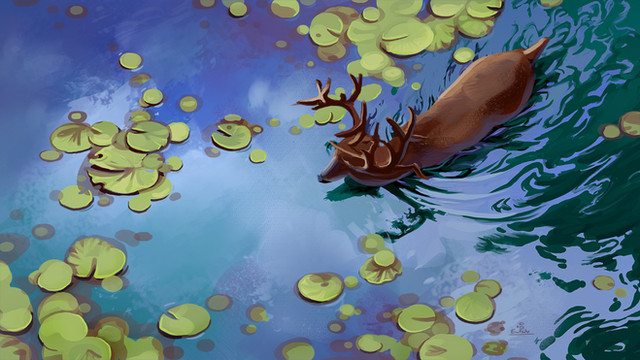 This is stunning, you did an amazing job on the water. There's a real sense of movement! If I were to critique one thing it would be what you've mentioned about the perspective being a little lost. I got the impression that the deer is already swimming in deep water from the ripples, therefore the shoulders wouldn't be that visible, if at all. However, it does look like its rump! It actually looks more like the deer is walking into deeper water from the shallows (: So I think it does work very well, even if it wasn't what you intended (and personally, gives a more "embarking on a journey" feeling)!