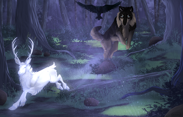 Here is a commission that I did for epicwang over on FA. This was supposed to be just a simple flat color, but erm well I got a little out of controlBut yes, somewhere amidst this overly detailed and heavily satured background is a blacktail doe version of a beautiful creature called Crow . Miss Crow likes ferns, mosses, and antlers. When attempting to design a believable scene for this lovely deer to fit in, I drove myself crazy. I need more background practice ok
